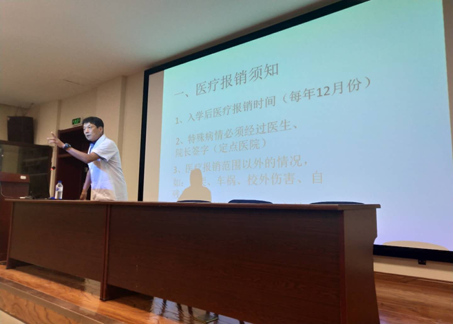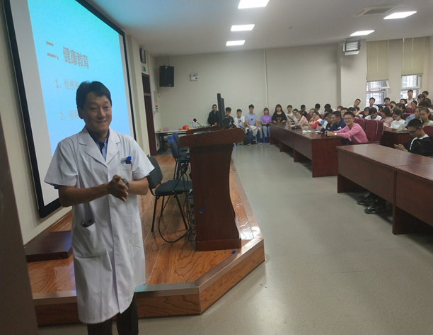 王东升老师向同学们介绍了医疗报销须知,包括入学后医疗报销时间、特殊病情必须经过医生、经理签字以及医疗报销额度等事项。并幽默地为大家举例说明了医疗报销范围以外的情况。着重讲解了健康教育的相关问题,内容涵盖结核病的类型介绍及发病症状、病毒性肝炎乙型的传播条件及治疗方法、食物中毒的防范等。并再三叮嘱同学们,一旦发现自己或他人有类似的病症,一定要及时和校医院沟通并进行医治。随后,王东升老师通过列举往年的患病实例,加深了同学们对这类严重的传染病的认识,强化了同学们对健康教育的重要性的理解。王东升老师幽默风趣的讲解将讲座变得生动有趣,场上时常响起同学们热烈的掌声和阵阵笑声。