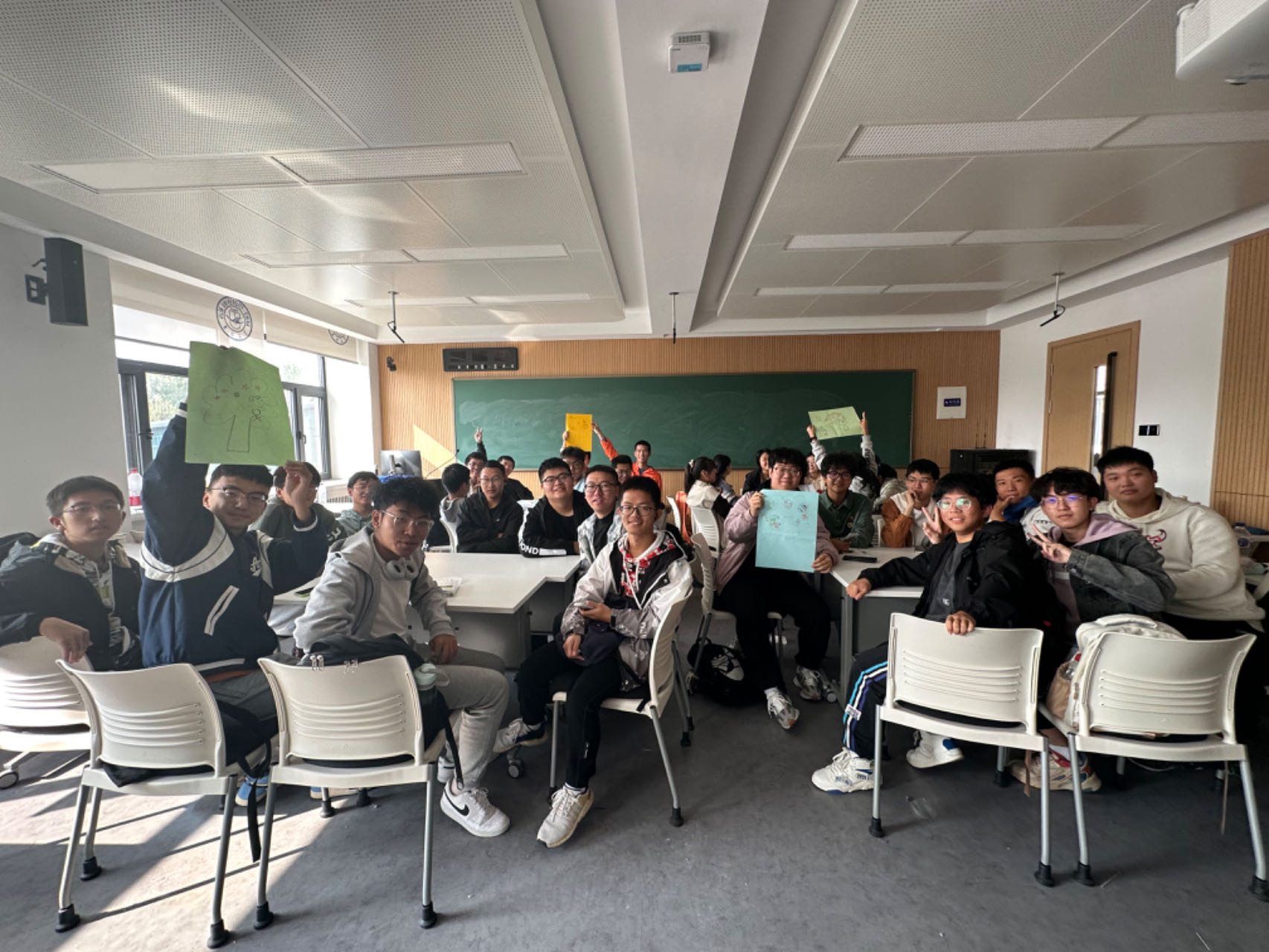 活动的第一个环节是“一分钟鼓掌”的热身游戏,同学们需要在游戏开始前对自己的鼓掌次数进行预测,并在实际游戏过程中记录鼓掌次数,通过对比预测和现实中的次数结果来分享游戏体会。大家从这个游戏中感悟到了设定合理预期目标和遵循职业生涯发展规划路线的重要性,懂得了只有结合具体条件明确自己在大学期间的目标并坚持执行,才会最终实现人生理想。随后,同学们随机分组,在依次进行简短的自我介绍后,正式开始了一系列趣味团体游戏。 在“信任之旅”的游戏中,同学们被分为两组,一组同学的双眼被蒙住来体验盲人的感觉,另一组同学作为领路人,在没有语言沟通的情况下带领第一组同学走到终点,培养了同学之间的信任感与合作精神。在“集体登陆”的游戏中,各小组的同学需要全部站到一张A4纸大小的范围内,大家集思广益,不断尝试,通过默契的配合顺利地完成了游戏的任务。在“人体字母”的游戏中,同学们利用自己的身体摆出不同的字母造型,合力完成了单词的拼写,展现出了强大的团队凝聚力。最后,大家拿起手中的画笔,以小组为单位,共同绘制出了团体树并写下了对于老员工活的美好期许,活动在一片欢声笑语中圆满结束。