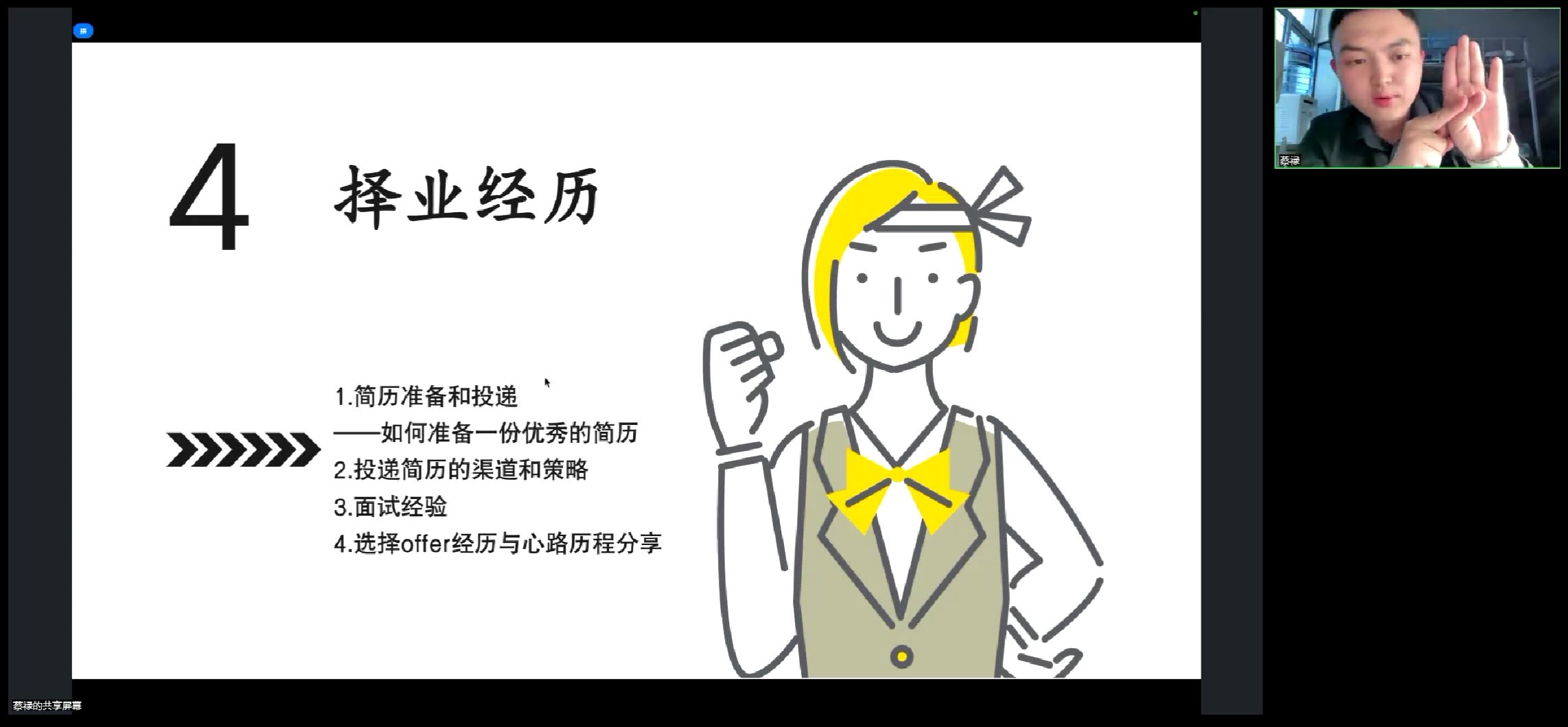 为引导员工了解当前就业市场需要,帮助员工树立正确的就业观、掌握求职相关方法技巧、提升就业竞争力,betway西汉姆联平台于5月24日举办“经验共鉴,职途启航”就业经验分享会,邀请2020级蔡禄同学担任主讲人,共130余名同学参与了此次分享会。