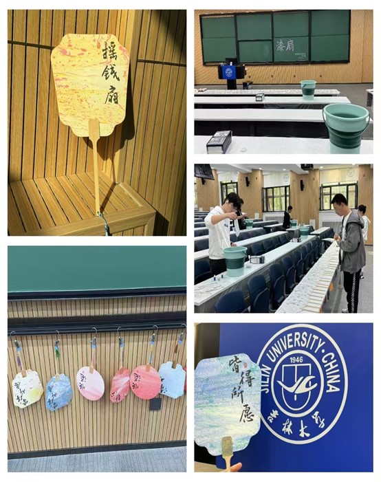 活动伊始,文艺部精心安排了漆扇制作教程展示,使同学们对这一古老而精湛的非物质文化遗产有了更加深入的了解和认识。在详细的讲解和示范后,同学们开始动手实践。他们根据个人喜好选择大漆颜色,将颜料滴入水中,用塑料棒轻轻搅动,水面上旋即绽放出色彩斑斓、变幻多姿的漩涡与纹路。接着,同学们将扇面缓缓沉入水中,通过细致的旋转和调整,漆料在扇面上流动、铺展,逐渐形成独具个性的艺术图案。随着时间的推进,一把把独特的漆扇在同学们的巧手下诞生,彰显了深厚的艺术魅力和无限的创意灵感。