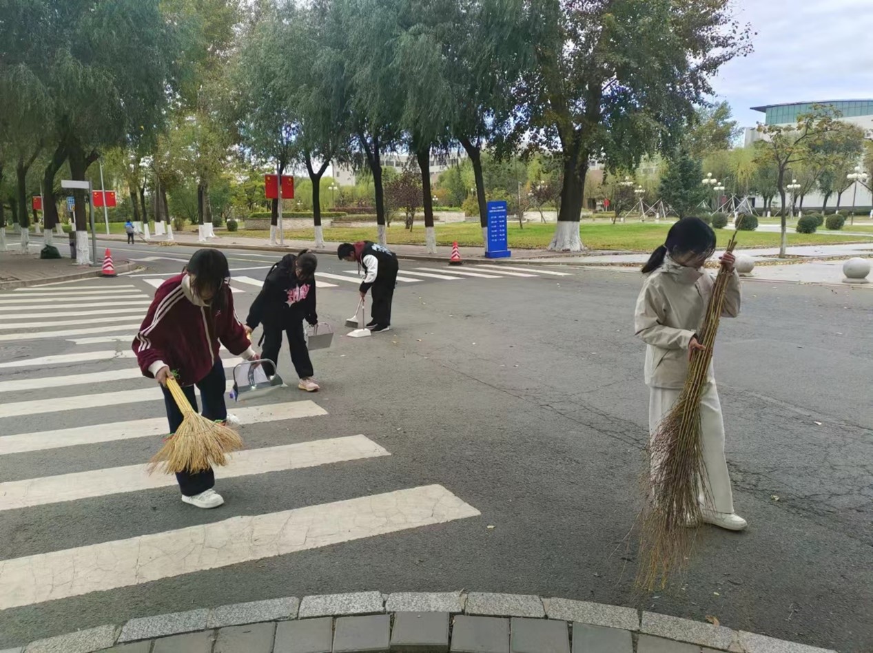 第一队从宋志平体育馆出发,途经清湖、三阶篮球场、田径场以及文苑社区;第二队沿湖畔餐厅向日新楼和中心体育馆方向前行。两队在法学楼短暂汇合后,继续围绕五月花广场清扫,最终在东门汇合。沿途无论是宽阔的道路还是狭窄的小径,无论是落叶堆积的角落还是杂草丛生的空地,都留下了同学们辛勤劳动的身影。同学们挥舞着手中的工具,认真清理每一处垃圾,仔细打扫每一个角落。汗水浸透了衣衫,却丝毫未能阻挡他们前进的步伐。