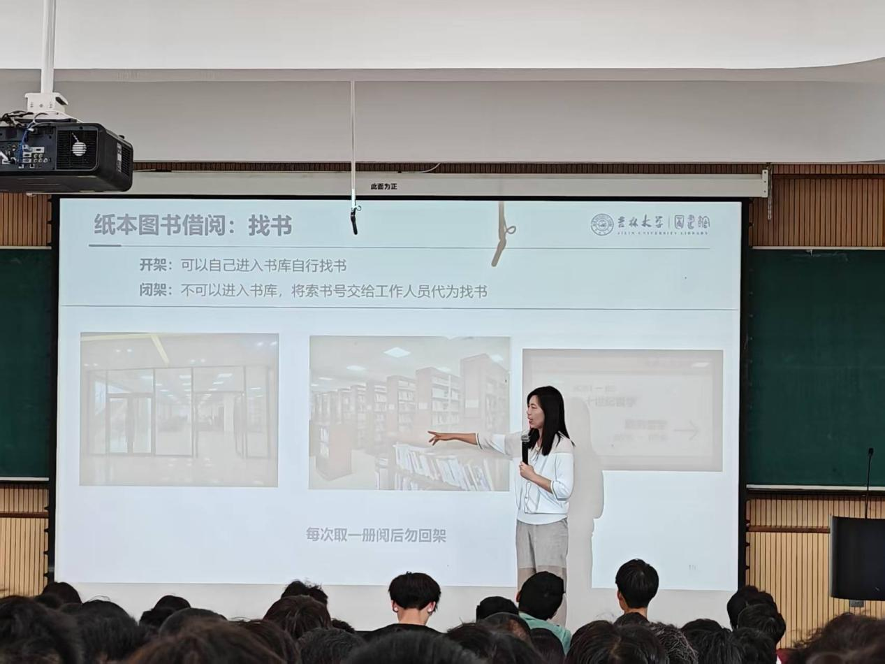 在特色服务环节,王丽丽重点展示了图书馆开展的各类文化活动和读者服务,体现出图书馆不仅是学习的场所,更是文化交流与思维碰撞的空间。她还特别强调遵守图书馆文明公约的重要性,呼吁同学们共同维护安静、整洁、有序的阅览环境,杜绝占座、喧哗等不文明行为。