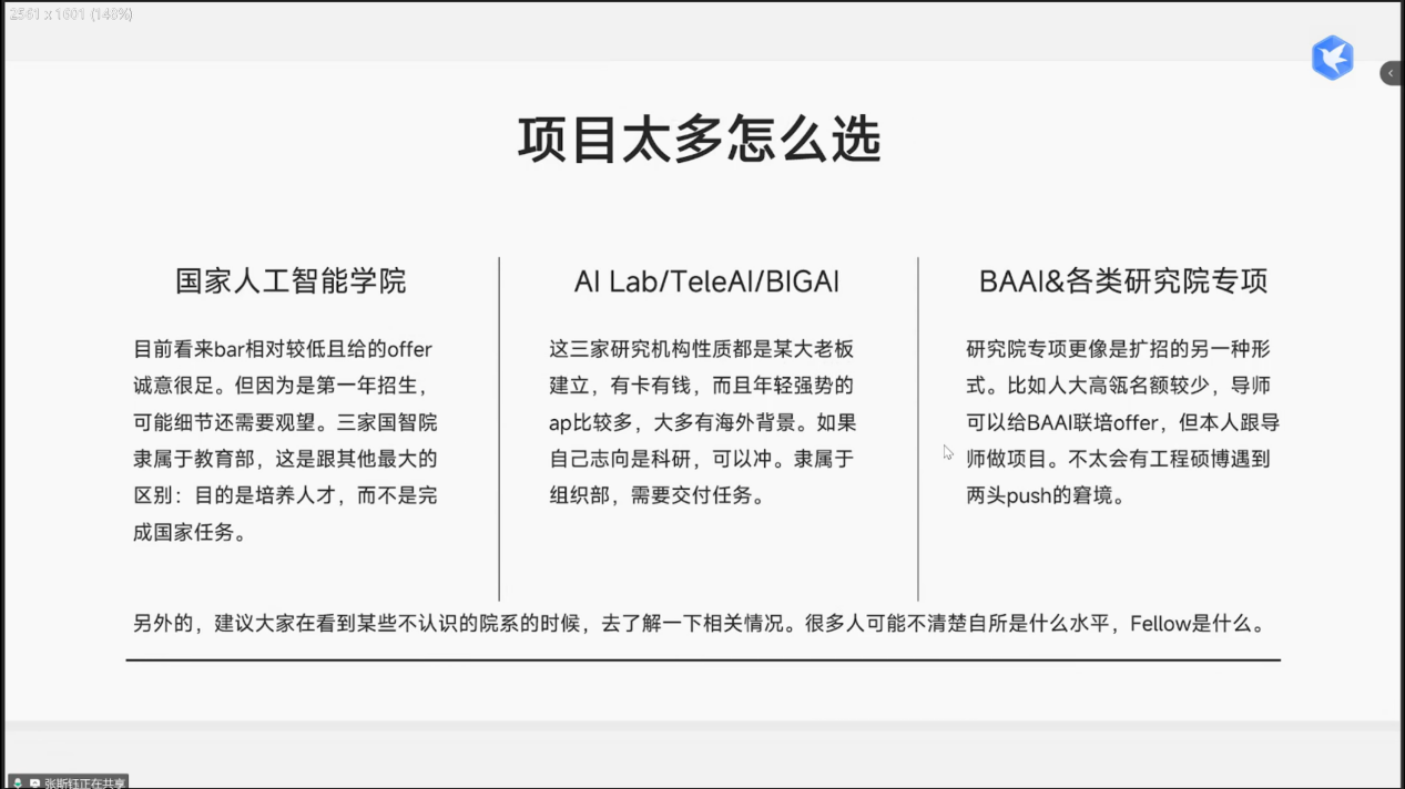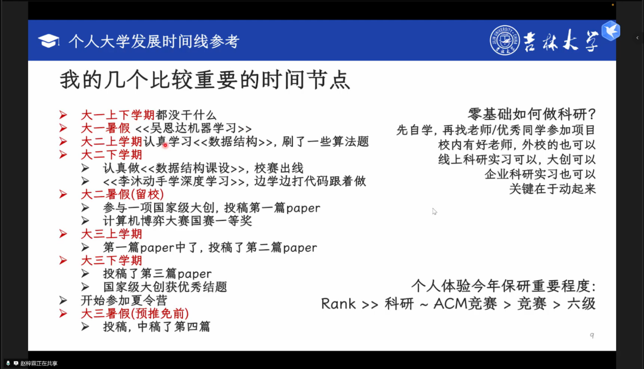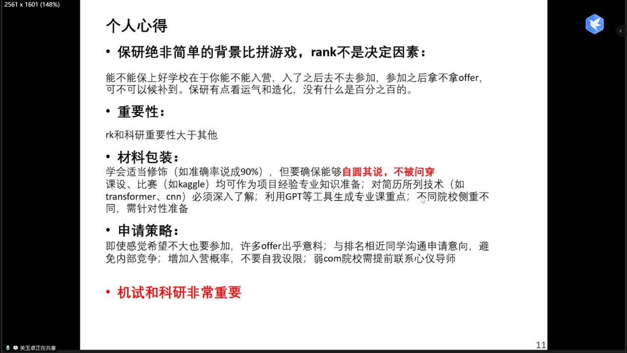会上,陈庆喜解读研招网政策,明确绩点定保研初试、目标校考核定复试的核心逻辑,她建议同学们从本科课设切入科研,通过阅读CCF A类论文、参与科研项目积累学术素养;鲍俊则拆解保研全周期,6-8月夏令营竞争最激烈,8-9月预推免是上岸关键期,9-10月9推/10推风险高,同时针对“rk(专业排名)”、“套磁”等保研常用术语进行科普;陈驰水结合自身经历,提出科研准备需结合职业规划,提醒大家减少“经验帖焦虑”,避免沉迷各类分享内容,应将重点放在入营后考核经验总结与自身能力提升上;关玉卓分享信息收集方法,推荐用表格对比院校情况实现精准选校,考核准备方面,她建议笔试针对性背目标校题库,机试每日刷5-6道LeetCode Hot100题,针对边缘同学,她建议采取“海投套磁”策略,梳理提炼自身参与的各类竞赛与课设经历,提升竞争力;赵梓霖强调选导师时应优先考虑科研方向匹配度,在套磁前应研读导师发表的论文,备考上,他推荐每日兼顾2小时算法训练与3小时项目推进,保持高效状态;平景龙提供多元化的保研路径参考,他推荐通过院校官网、ResearchGate等平台搜集导师信息,为排名不占优同学介绍工程硕博、国优计划等小众路径,提醒大家在面试时突出个人核心优势;张斯钰建议同学们按规划理性选校,若大家以就业为目标,应侧重“集团title+实习资源”,若计划走科研道路,则需优先考虑“导师水平+课题组实力”。