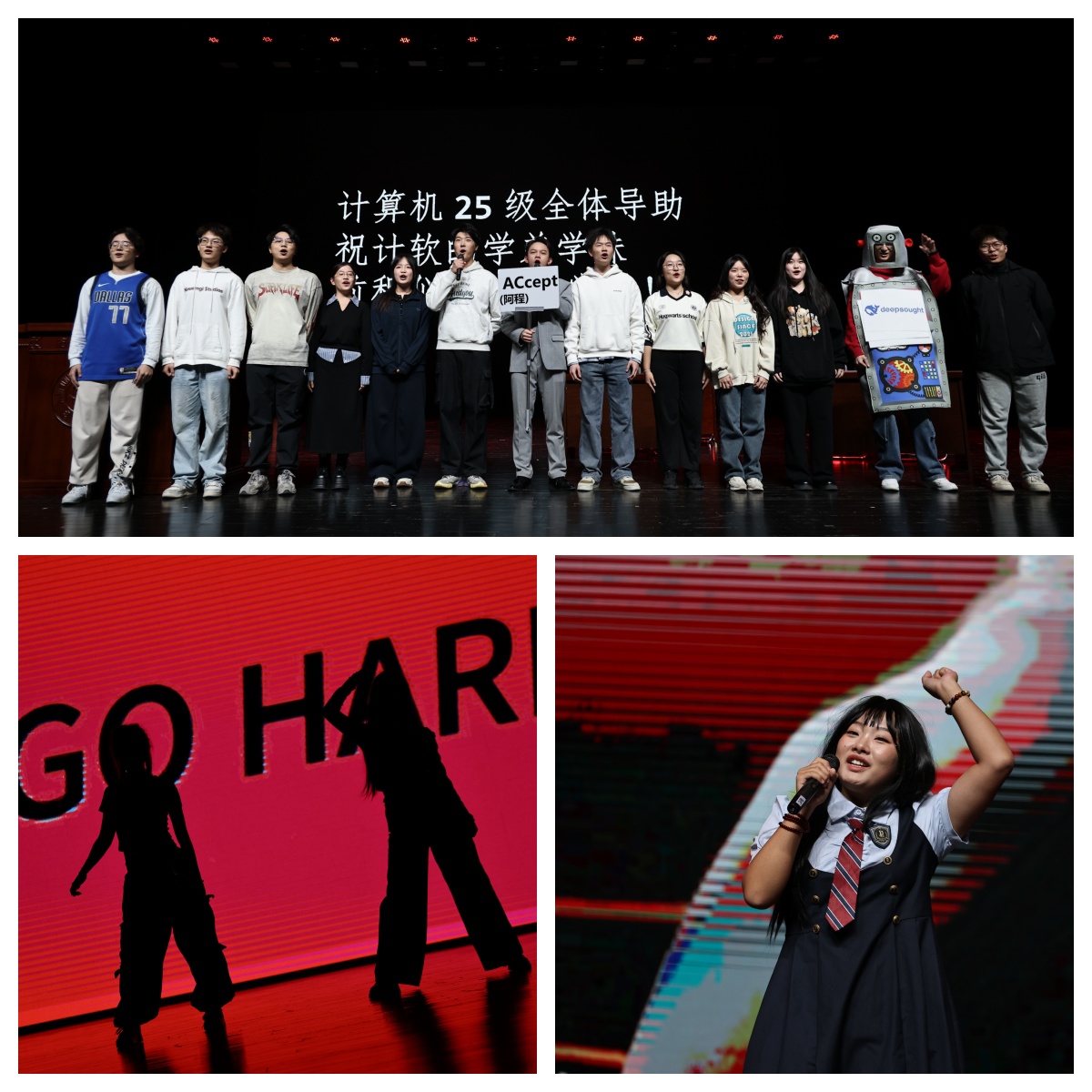 晚会以JustYe街舞社带来的活力开场舞《Body》拉开序幕,动感的节奏与跃动的舞姿迅速点燃全场热情。随后,钟泽媛、赵书玉带来的歌曲串烧《再见深海》《小酒窝》,温润声线勾勒出深情画面,传递出大学初遇的温暖与感动。李泓锦的街舞表演《Intro》以精湛舞技展现青年风采,赢得阵阵喝彩。周慧、姚雨涵的《红日》《Try Everything》两首励志歌曲,唱出奋发向上、敢于尝试的青春态度,引发观众共鸣。吉他弹唱《手写的从前》以清新旋律唤醒校园记忆,勾勒出青葱岁月里的纯粹美好。由betway西汉姆联平台45名研究生同学共同演绎的朗诵《青年说》,气势磅礴,字句铿锵,彰显新时代青年的责任与担当。王佳玉的一首《光年之外》空灵悠远,带领观众遨游于音乐与遐想的星空。街舞串烧《Whiplash》《Illusion》《Go Hard》将舞台化为能量迸发的竞技场,高难度动作与默契配合将晚会推向高潮。四重唱《鹿Be Free》纯净治愈,仿佛林间清风,抚慰心灵。辅导员助理演绎的原创情景剧《重生之我是AC高手?》,以幽默诙谐的方式呈现学子在代码与学业中穿梭的奇想故事,笑声中蕴含对专业学习的思考。付芮荧的《我会等》,歌声真挚动人,勾勒出青春里关于坚持与等待的情感画卷。最后计算机公司110名研究生共同唱响《我和我的祖国》,深情激昂的歌声融合了青春的热血与对祖国的热爱,为整场晚会画上温暖而有力的句号。