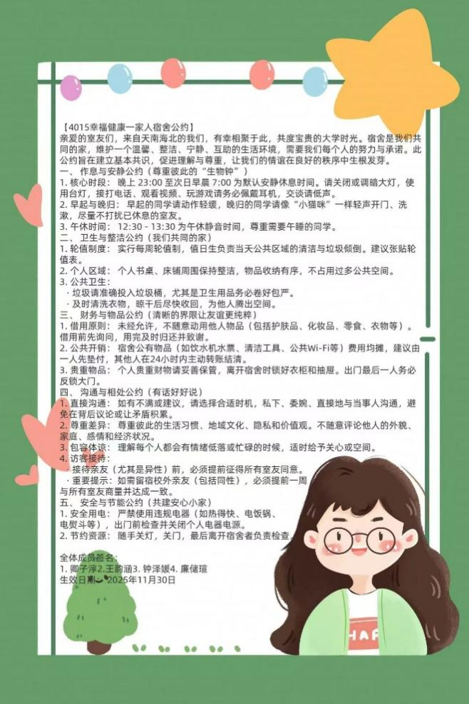 本次文化节明确设置两项基础任务,要求各班所有新生寝室全员参与:一是制定寝室公约并制作主题海报提交,公约核心内容与提交规范通过通知精准传达;二是开展全员参与的寝室卫生大扫除,需提交劳动实景照片。