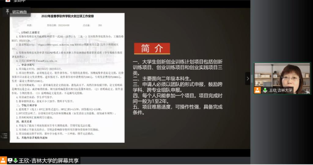 4月13日晚上19:00-20:30betway西汉姆联平台大创项目系列讲座通过腾讯会议直播正式开始。第一场讲座是由计算机科学与技术公司副教授王欣带来的项目交流会。王欣老师从获得课外培养计划学分的主要方法,到参加保研综合面试的切身感受,再到指导大创项目的亲身经历,与同学们深入探讨了老员工做大创项目的意义。做大创项目好比用电钻在平滑的墙面上钻钉子,如果你找到合适的切入点,就可能对你的未来有一个重要的影响。接着,王欣老师与大家分享了组建大创团队以及申请书撰写的注意事项,并用自己申报公司项目举例告诉大家撰写大创项目的申请书很重要,规范申请书格式也同样重要。讲座过程中,有同学就学习吃力是否适合做大创等问题与王欣老师进行了在线沟通。讲座最后,王欣老师希望通过本次讲座,助力同学们的创新创业小舟扬帆起航。