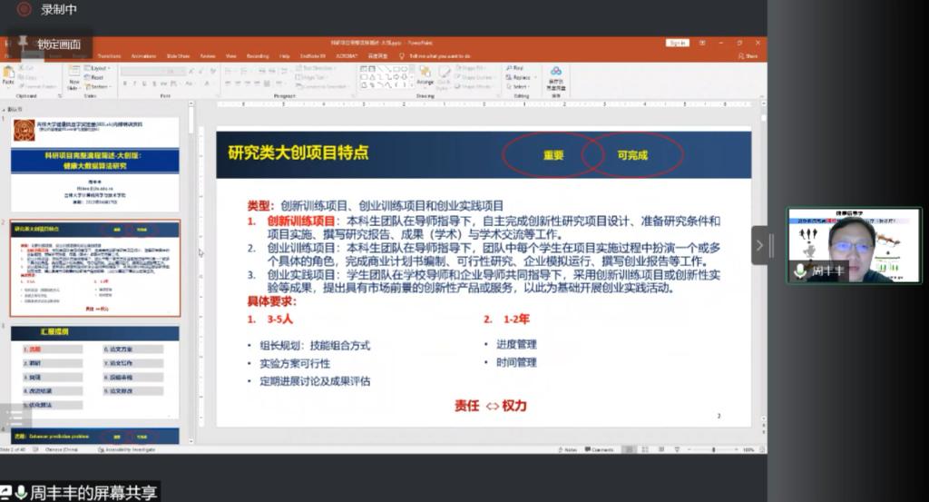 4月17日晚上19:00-20:30betway西汉姆联平台大创项目系列讲座第四场如约而至。计算机科学与技术公司教授、博士生导师周丰丰为同学们带来了以“研究类大创项目全流程规划”为主题的腾讯会议直播讲座。首先,周丰丰老师为大家简要介绍了研究类大创项目的整体规划和时间节点。接下来,周丰丰老师以科研项目选题的可行性为切入点,结合实验室发表文章的实例为同学们详细讲解了论文选题、调研、复现、改进结果、优化算法、论文方案、论文写作、投稿审稿等环节的注意事项。周丰丰老师建议大家在研究工作中培养严谨的工作态度和良好的工作习惯,如遇退稿要认真回复编辑和审稿人的所有意见,如暂离工作要做好文档、论文或实验数据的保存备份,切莫因小失大。最后,周丰丰老师表示良好的开端是成功的一半,希望大家多做研究、多发论文。